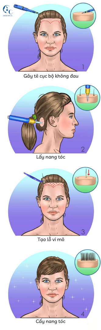 Trước tiên, bác sĩ sẽ xác định vùng hiến tóc khỏe mạnh (thường ở phía sau đầu) để lấy nang. Không giống như nam giới, phụ nữ không cần cạo toàn bộ đầu — chỉ một phần nhỏ ở vùng hiến được cắt ngắn, và phần tóc xung quanh sẽ dễ dàng che phủ khu vực này, giúp bạn tiếp tục sinh hoạt và làm việc bình thường mà không ai nhận ra.