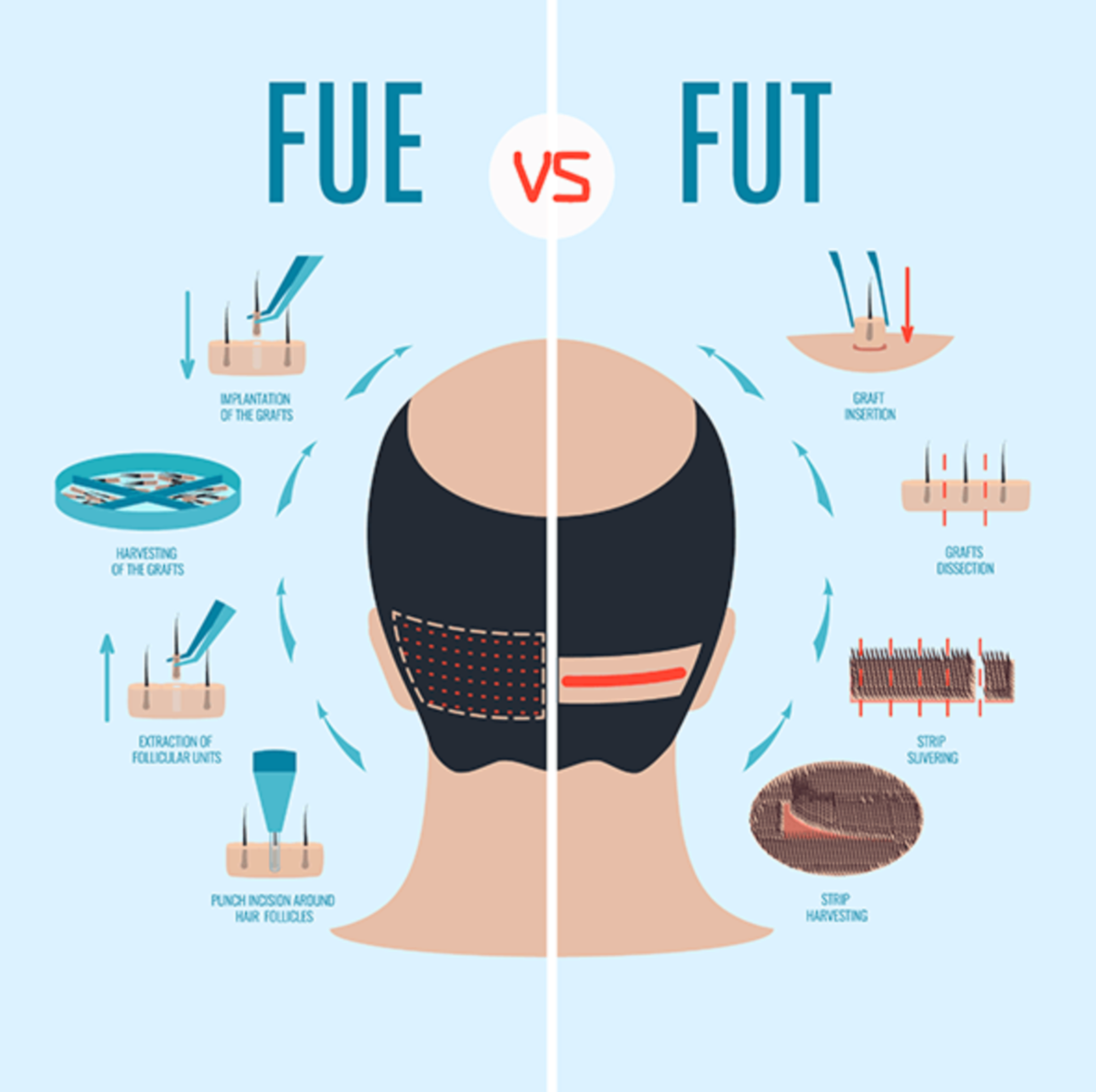 Cả hai phương pháp đều dựa trên việc lấy từng nang tóc từ vùng hiến khỏe mạnh và cấy vào vùng cần phục hồi dưới gây tê tại chỗ.