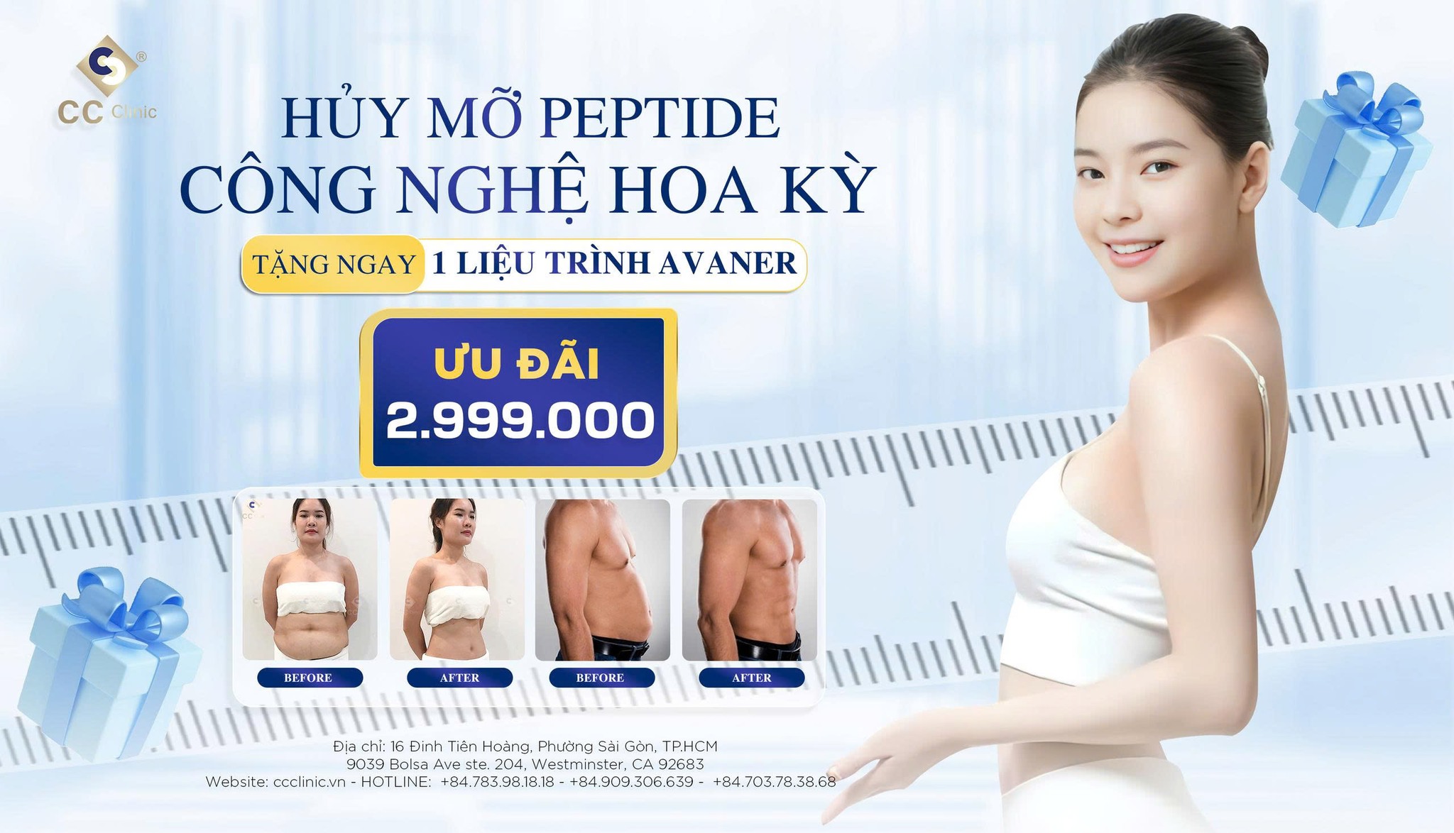 Công nghệ giảm mỡ toàn thân Peptide tại Thẩm mỹ CC được hoạt động hiệu quả nhờ vào cơ chế kích thích quá trình phân hủy tế bào mỡ, hỗ trợ đào thải mỡ thừa ra khỏi cơ thể thông qua cơ chế chuyển hóa tự nhiên. Không chỉ giúp giảm mỡ, phương pháp này còn hỗ trợ cải thiện độ săn chắc của làn da, hạn chế tình trạng chùng nhão thường gặp sau khi giảm cân.